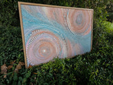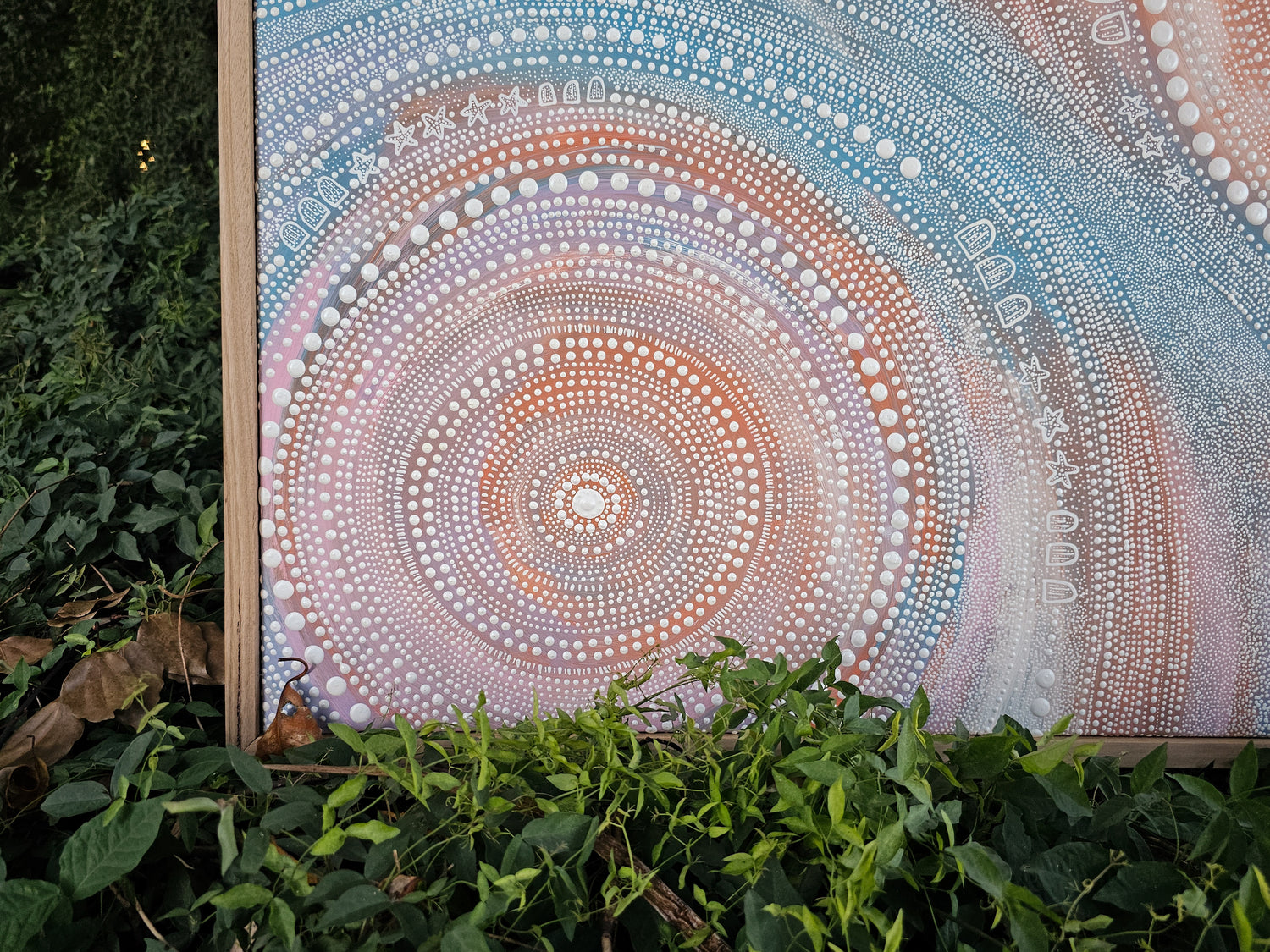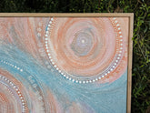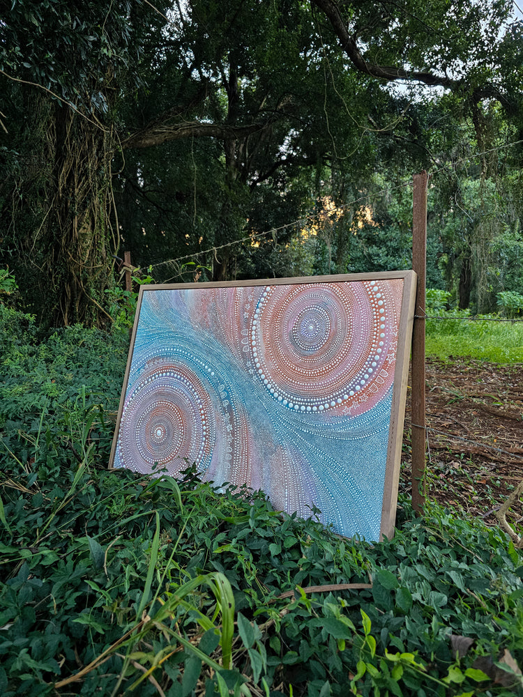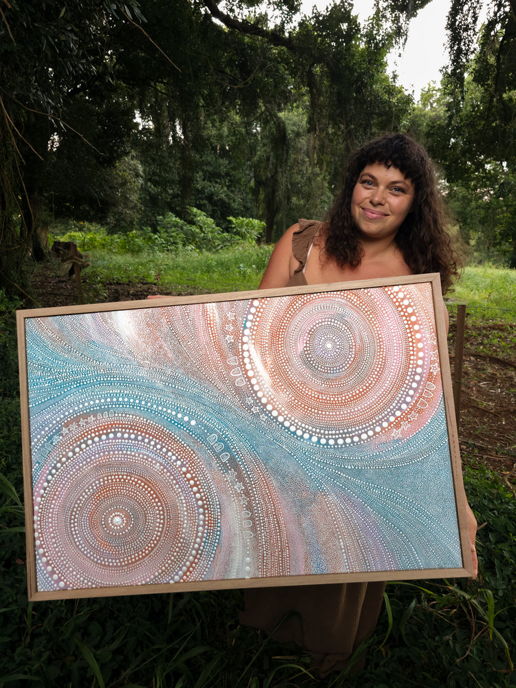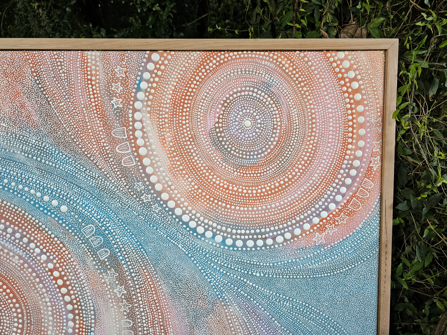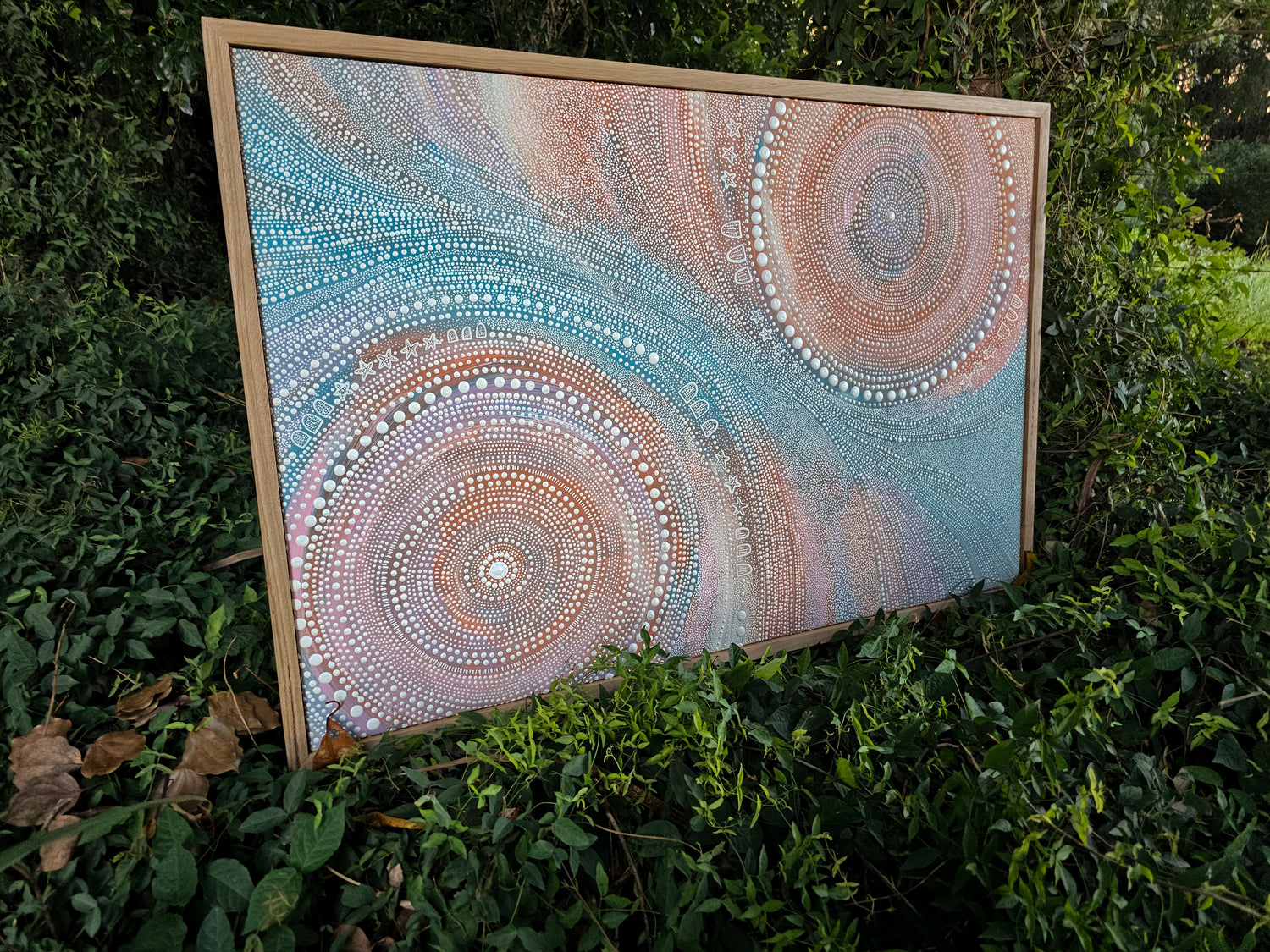 I created Pulse to capture the beautiful energy of the sea—its rhythm, its life, its movement, nourishing everything it touches. I wanted this artwork to feel alive, as if the sea had a pule. The sea has always been essential to life here in Australia. For countless generations, its resources have sustained us, traded far and wide by our ancestors, across ancient trade routes that stretched from the coast to deep into the heart of this land.