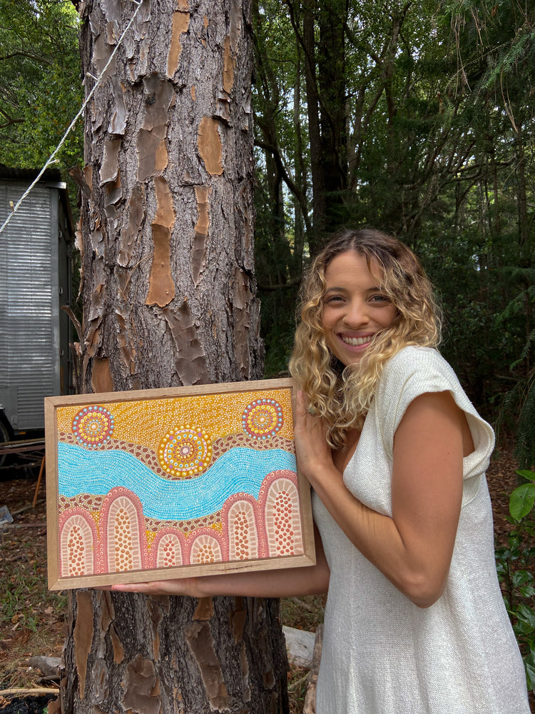 This artwork is called Narooma a word associated with blue water and running water. I wanted to celebrate the mountains and water, and simply display how significant they are to our people. The water runs through the center of the artworks, as it is the center of many dreaming stories and was such an integral part of our ancestors life's who lived tribally. The stones run along the sides of the river and symbolize the many boulders and rocks that lay on the creek beds around the Gundungurra region. Along the top are the camp circles that were often set up along the life giving river.