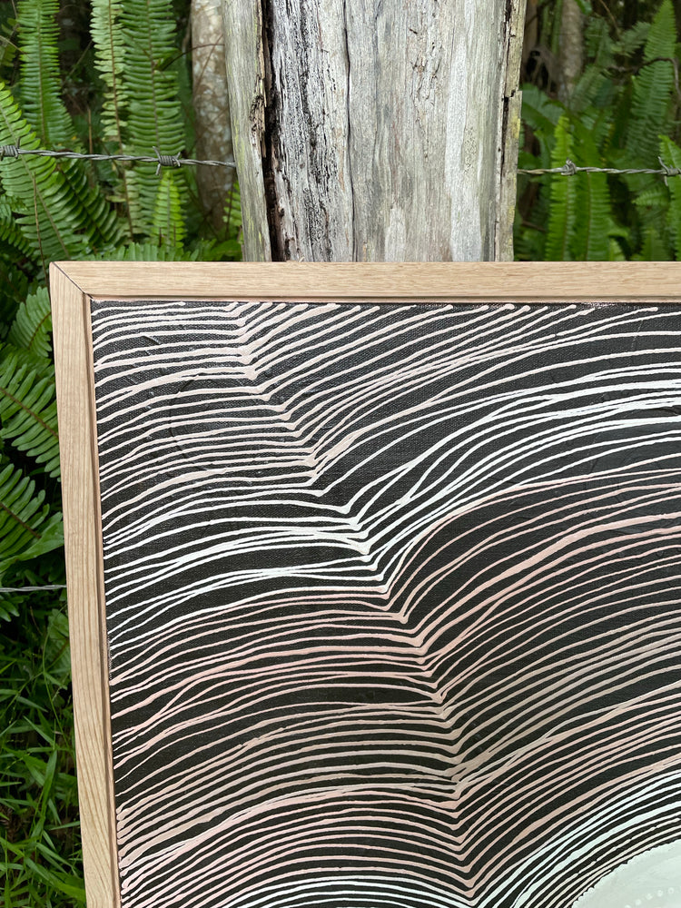 This piece shows moonlit mountains under the night sky. Here I have displayed pathways in the sky rather than stars, to demonstrate the importance of journey and navigation the night sky had for our ancestors. The stars are an incredibly important and an essential tool within ancient Indigenous cultures, our people were strongly entwined and held in-depth knowledge of the sky and stars.