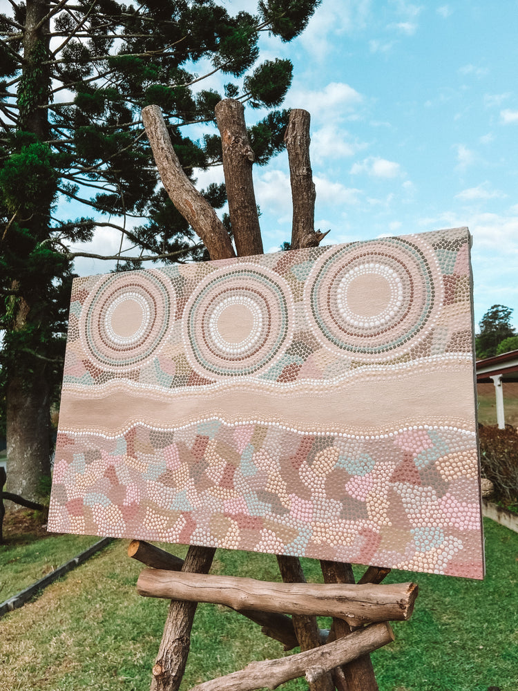 This artwork celebrates the great trade route that passes from the Blue Mountains down into Sydney and beyond. The highway from Sydney to the Blue Mountains region actually follows the original ancient trade route of our people. The circles represent different camps and communities along the trade route, and the small clusters of dots represents both connection and diverse stories and song lines that exist amongst our people.