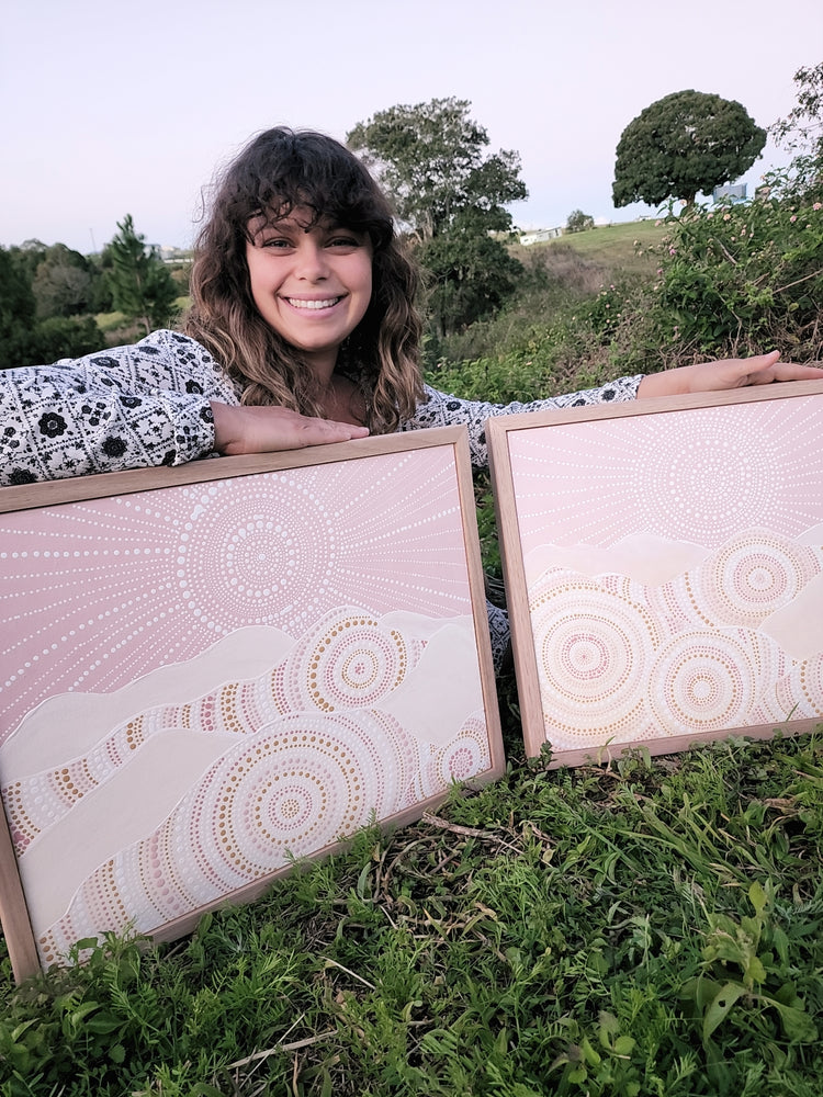 Story: When you walk along the cliff edges of Gundungurra Country, you will notice the sandstone cliffs beneath your feet, revealing its very core made from magnificent hues of pink, orange, and beige. It is as though the mountains speak to you, giving you the most beautiful place to sit and rest while you look upon the majestic forests and waterways of the Blue Mountains region. These sandstone mountains make up the earth in many places within Gundungurra nation, they hold many stories and are a true source of strength. Here I display family circles held within the mountains, I also wanted their strength amplified through a radiant sun in the sky