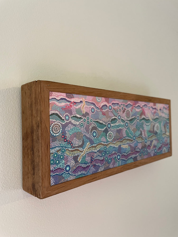 For our ancestors, life was centered around the great river systems. Even our most ancient songline describes the creation of the great rivers that pass through the Gundungurra region and Burragorang Valley. This painting depicts the joy and sacredness found in the river systems and water, and the life that it gave to our people.