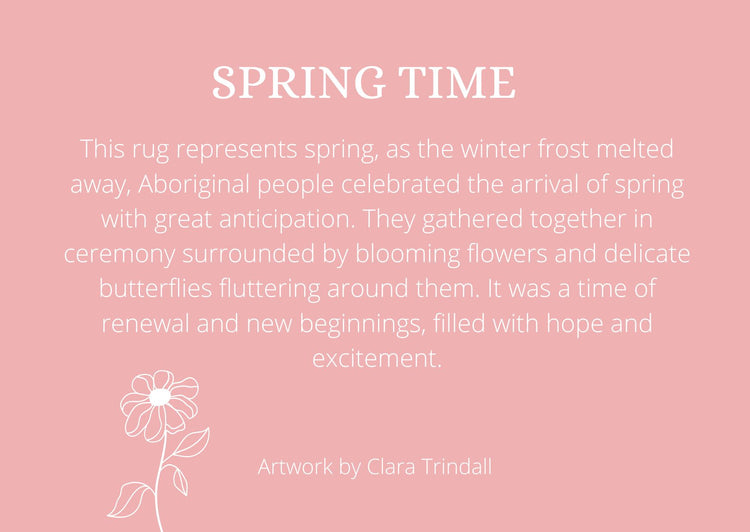 This rug represents spring, as the winter frost melted away, Aboriginal people celebrated the arrival of spring with great anticipation. They gathered together in ceremony surrounded by blooming flowers and delicate butterflies fluttering around them. It was a time of renewal and new beginnings, filled with hope and excitement.