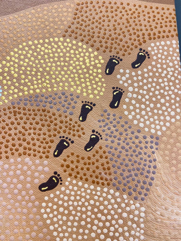 Community circles, foot prints and journey lines run through the artwork with people gathered to represent the different paths we walk and the people we connect with throughout our lives.