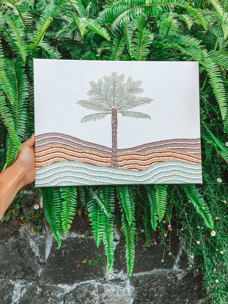 This artwork depicts the beautiful tree fern seen throughout the Gundungurra country. The layers under the fern represent the dirt, red rocks, clay and greenery that fill the earth over our magnificent home lands.