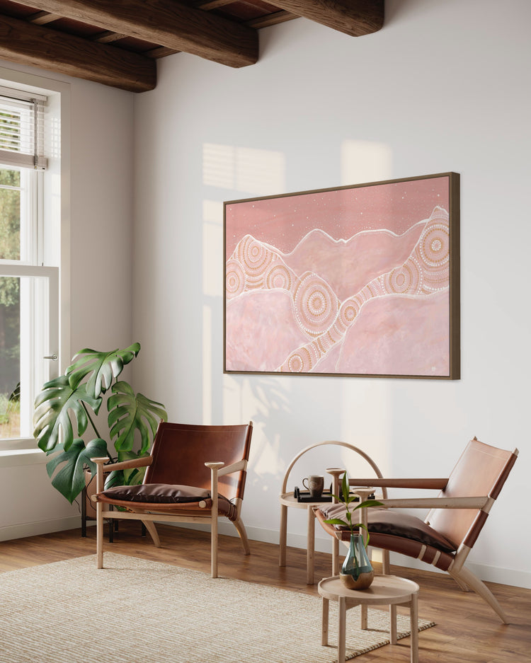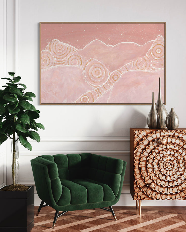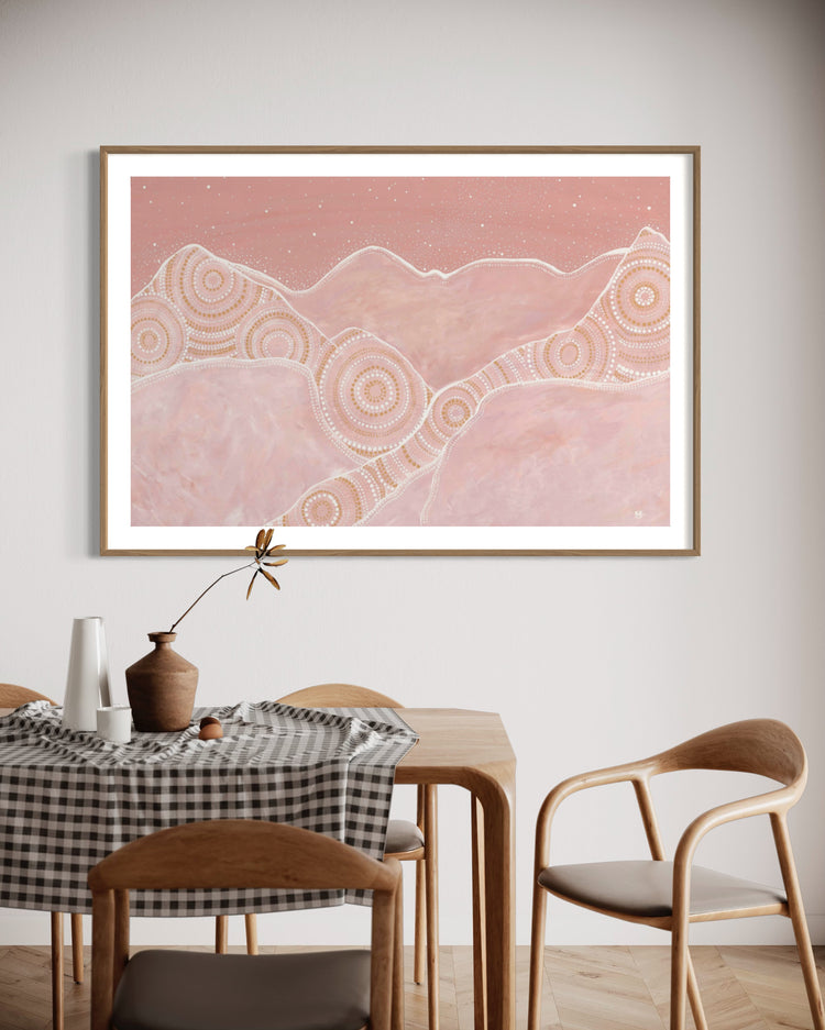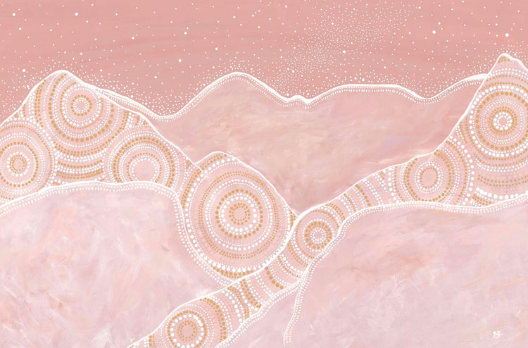 When you walk along the cliff edges of Gundungurra Country, you will notice the sandstone cliffs beneath your feet, revealing its very core made from magnificent hues of pink, orange, and beige. It is as though the mountains speak to you, giving you the most beautiful place to sit and rest while you look upon the majestic forests and waterways of the Blue Mountains region. These sandstone mountains make up the earth in many places within Gundungurra nation, they hold many stories and are a true source of strength. Here I display family circles held within the mountains, I also wanted to display the stars here, to amplify the deep connection our ancestors held not only with the earth beneath them, but the sky above.